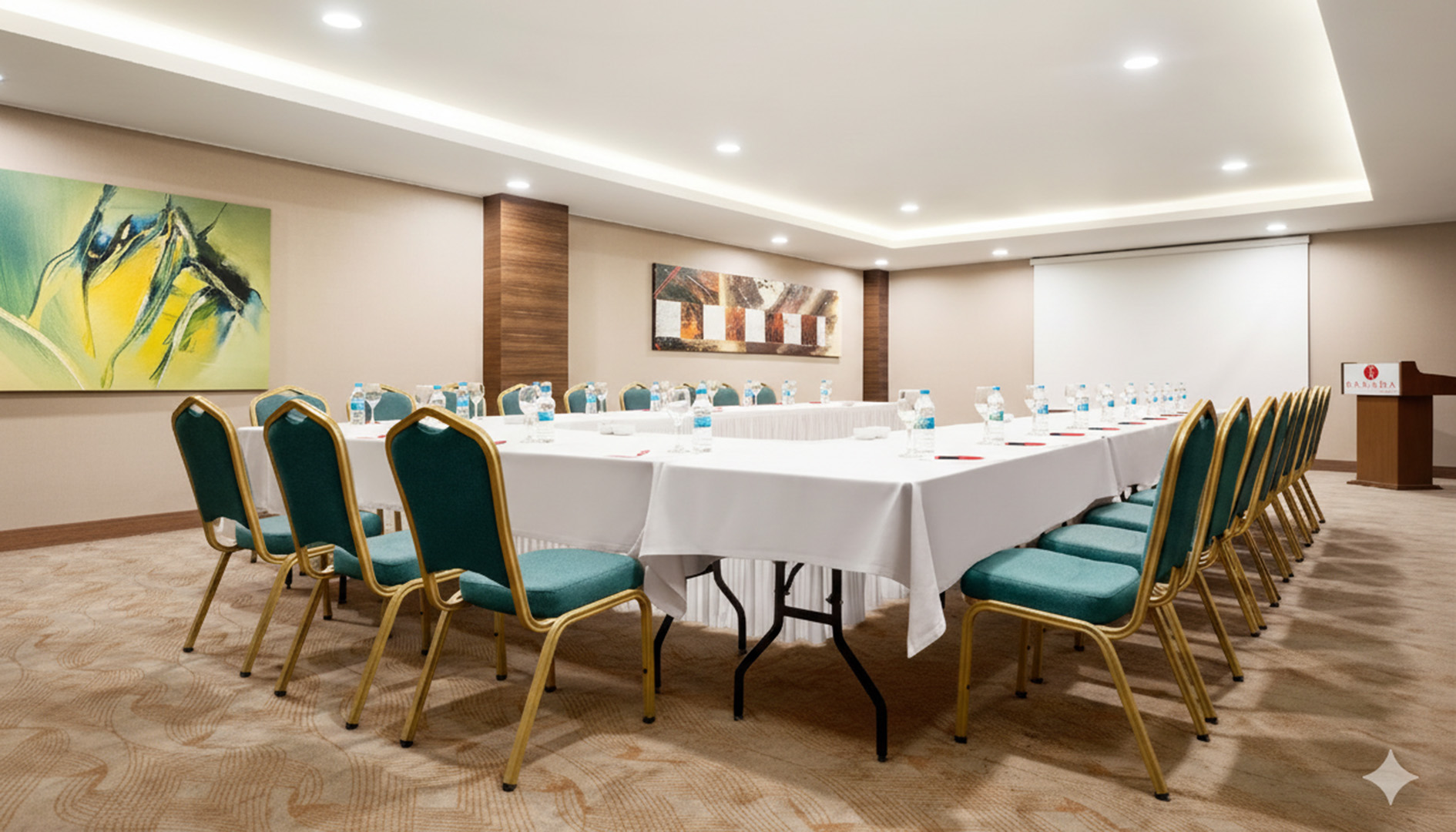 Tiyatro, sınıf, U masa veya gala düzenine kolayca uyarlanabilen geniş kullanım alanı.